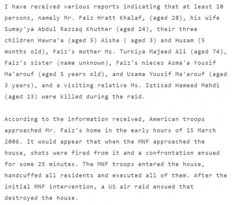 Estratto della lettera del 27 marzo 2006 del Rapporteur speciale delle Nazioni Unite sulle esecuzioni extragiudiziarie, sommarie o arbitrarie, rivelate da Wikileaks